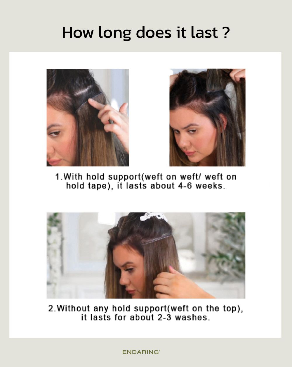 Each application lasts 4–6 weeks with proper care. The hair itself is 100% Virgin Remy human hair and can be reused multiple times when reapplied with fresh tape.