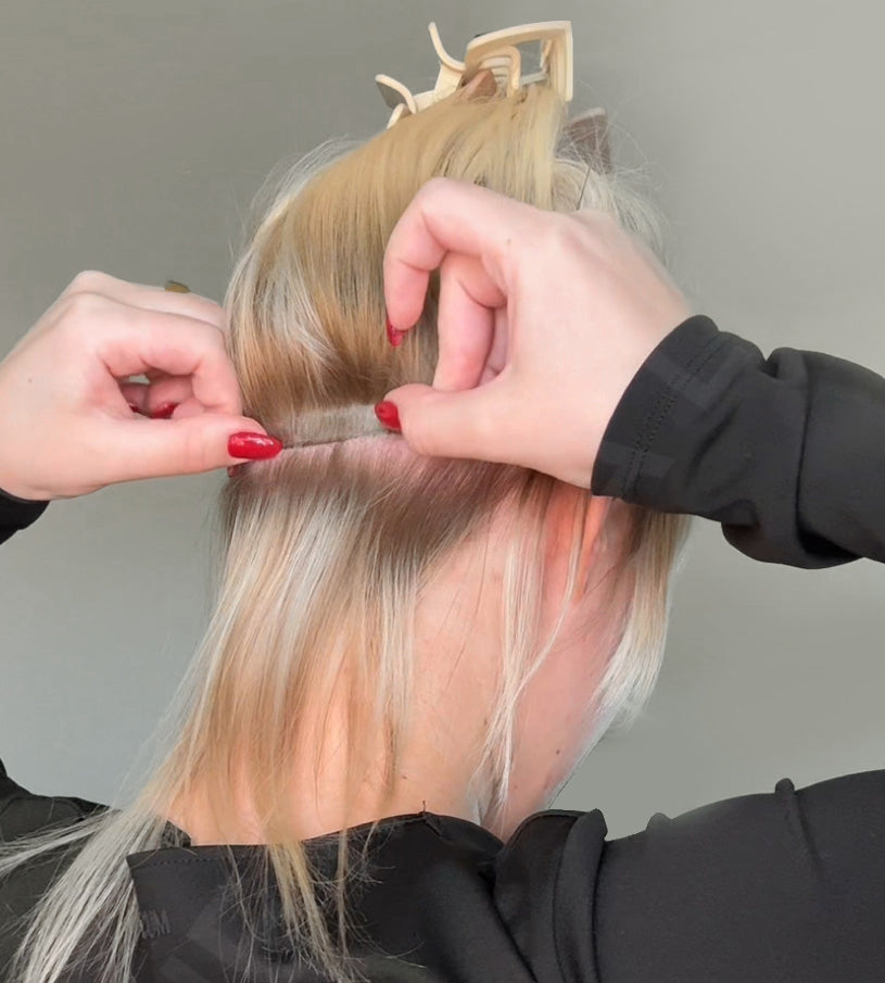 Invisible Tape-In Wefts feature a long, root-colored band with no shiny tab. They lay flatter, blend more naturally, and require fewer panels for the same amount of coverage. In contrast, traditional tape-ins often use short, square tabs with visible adhesive and a shiny finish, which can be bulky and noticeable, especially near the part or crown.